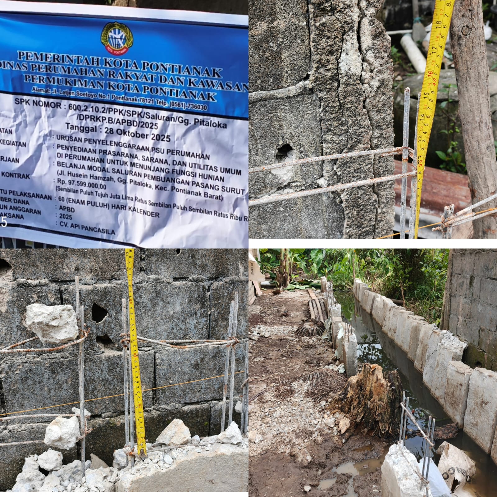 Pekerjaan yang tengah berlangsung berupa belanja modal pembangunan saluran pembuangan pasang surut di Jl. Husein Hamzah, Gg. Pitaloka, Kecamatan Pontianak Barat, dengan nilai kontrak Rp 97.599.000, waktu pelaksanaan 60 hari kalender, bersumber dari APBD Tahun Anggaran 2025, dan dilaksanakan oleh CV Api Pancasila.